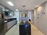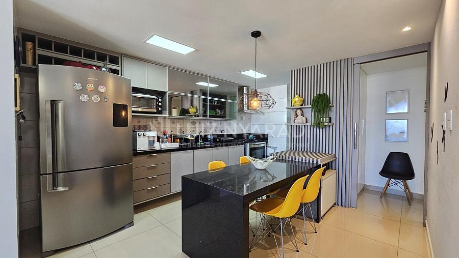 O apartamento possui três suítes confortáveis no primeiro pavimento, garantindo privacidade e conforto para todos os moradores. A cozinha em conceito aberto é bem iluminada e arejada, proporcionando um ambiente agradável para preparar suas refeições e desfrutar dos momentos em família. Há também uma área de serviço separada e banheiro de apoio.