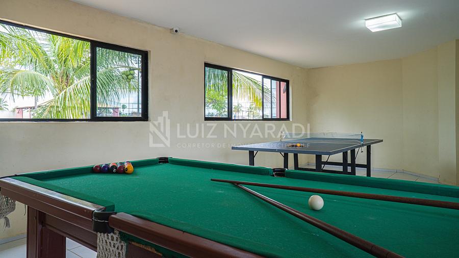 Área de lazer com piscina adulto e infantil, bar molhado, churrasqueiras, salão de festas e jogos, academia, sauna, campo de futebol, quadra de ténis e vôlei, baias para cavalos, playground, água, internet a cabo.
